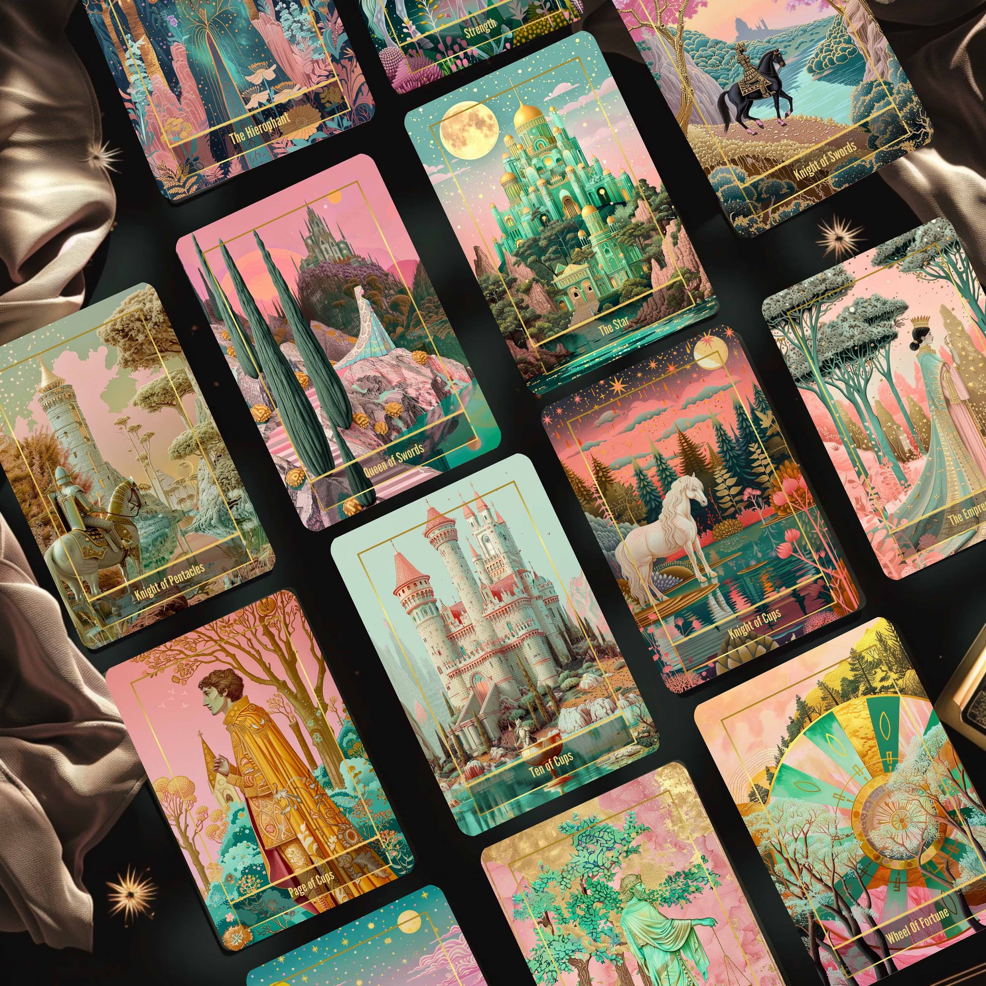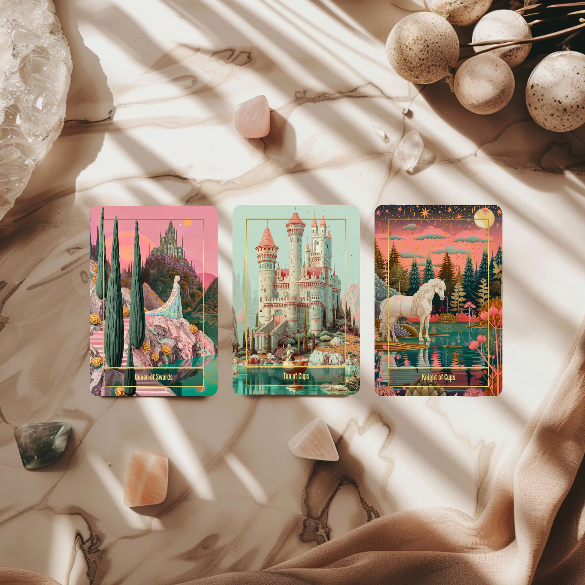 Every illustration begins with original concepts and custom prompts, then is hand-finished to refine shapes, balance light and color, add textures and ornamental details, adjust symbolism, and ensure consistency across the full deck. AI is used as a supportive tool—each final piece is curated and refined through an artist’s design process.