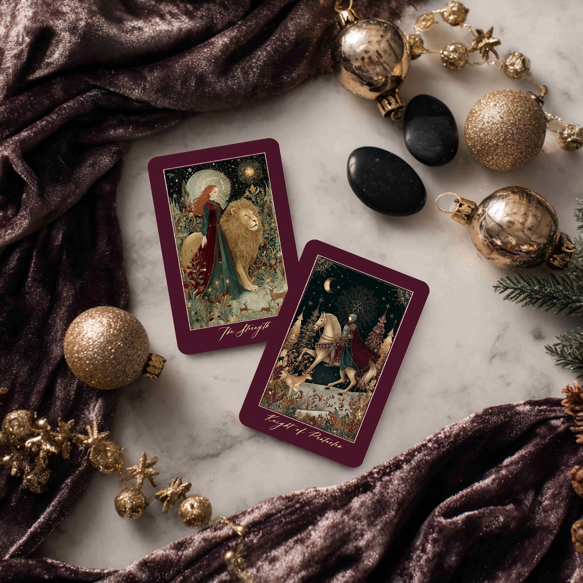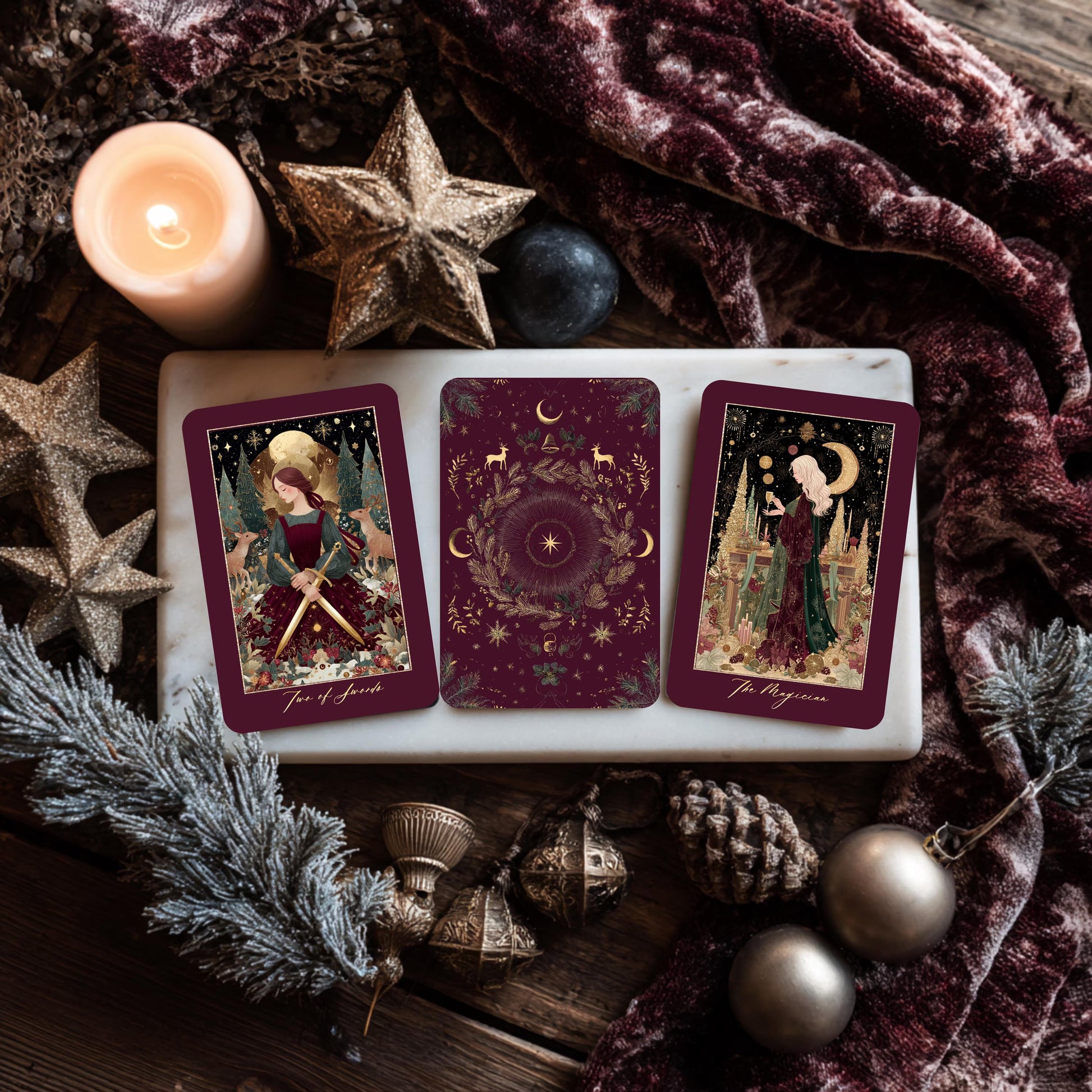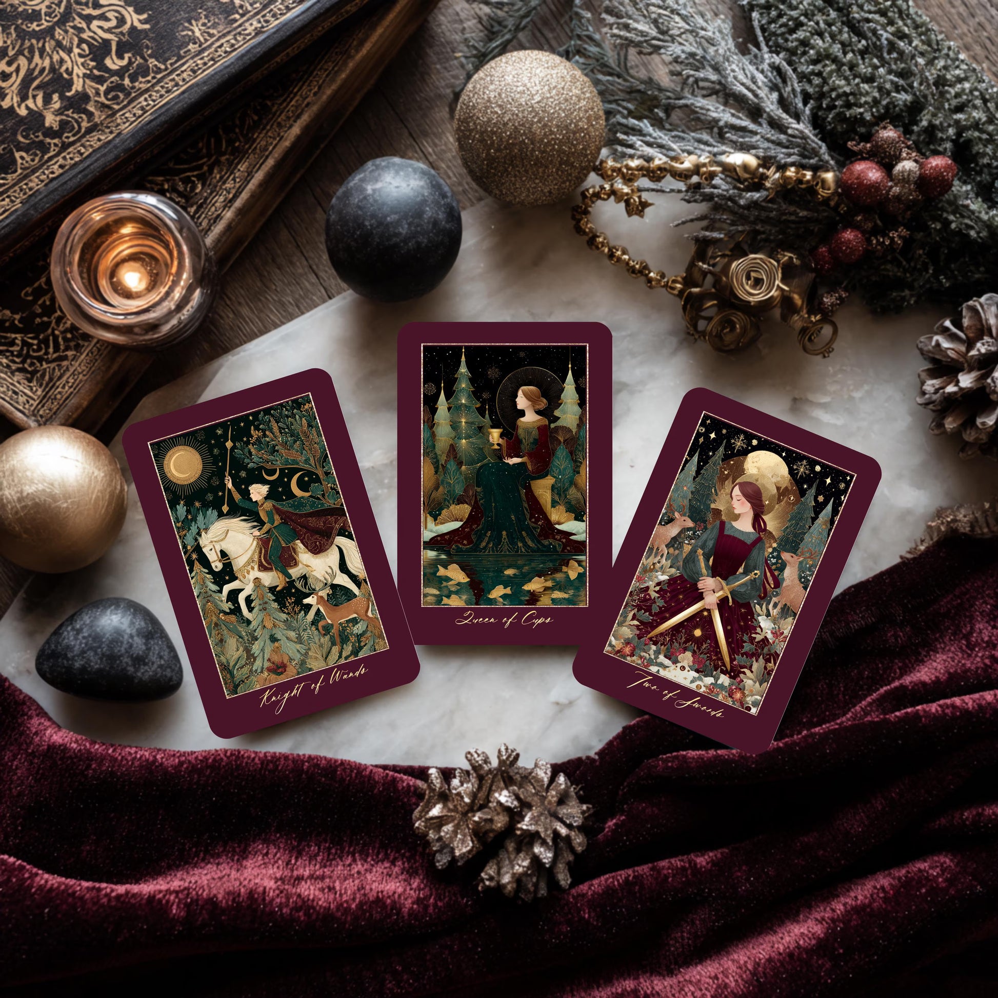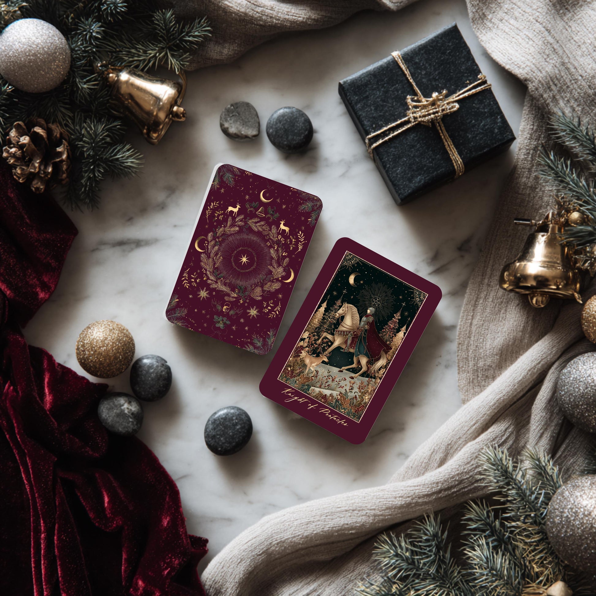 - Classic tarot symbolism with a Christmas Eve-inspired atmosphere and serene, story-rich scenes
