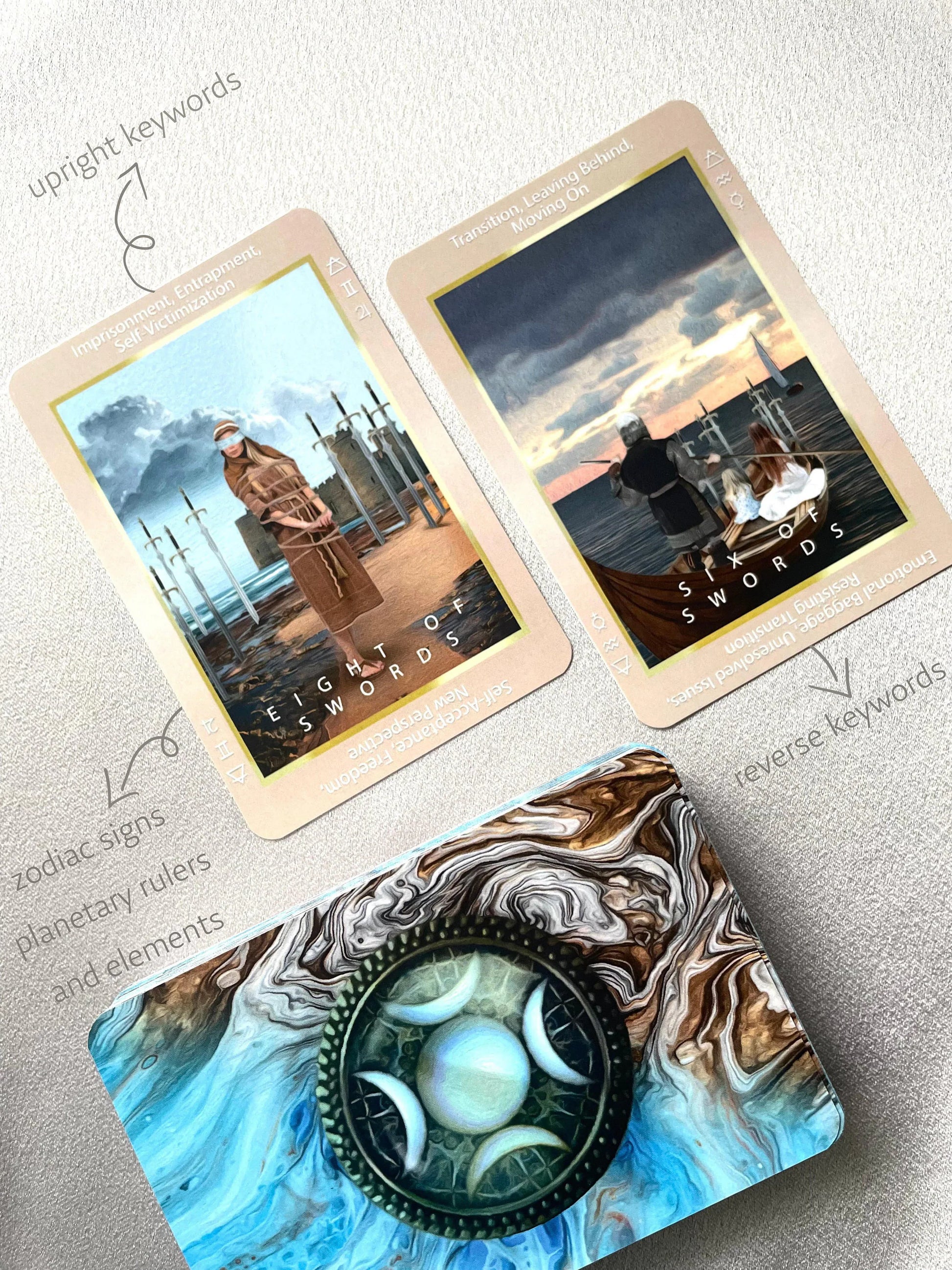 - Upright + reversed keywords printed on the cards to support study and faster readings