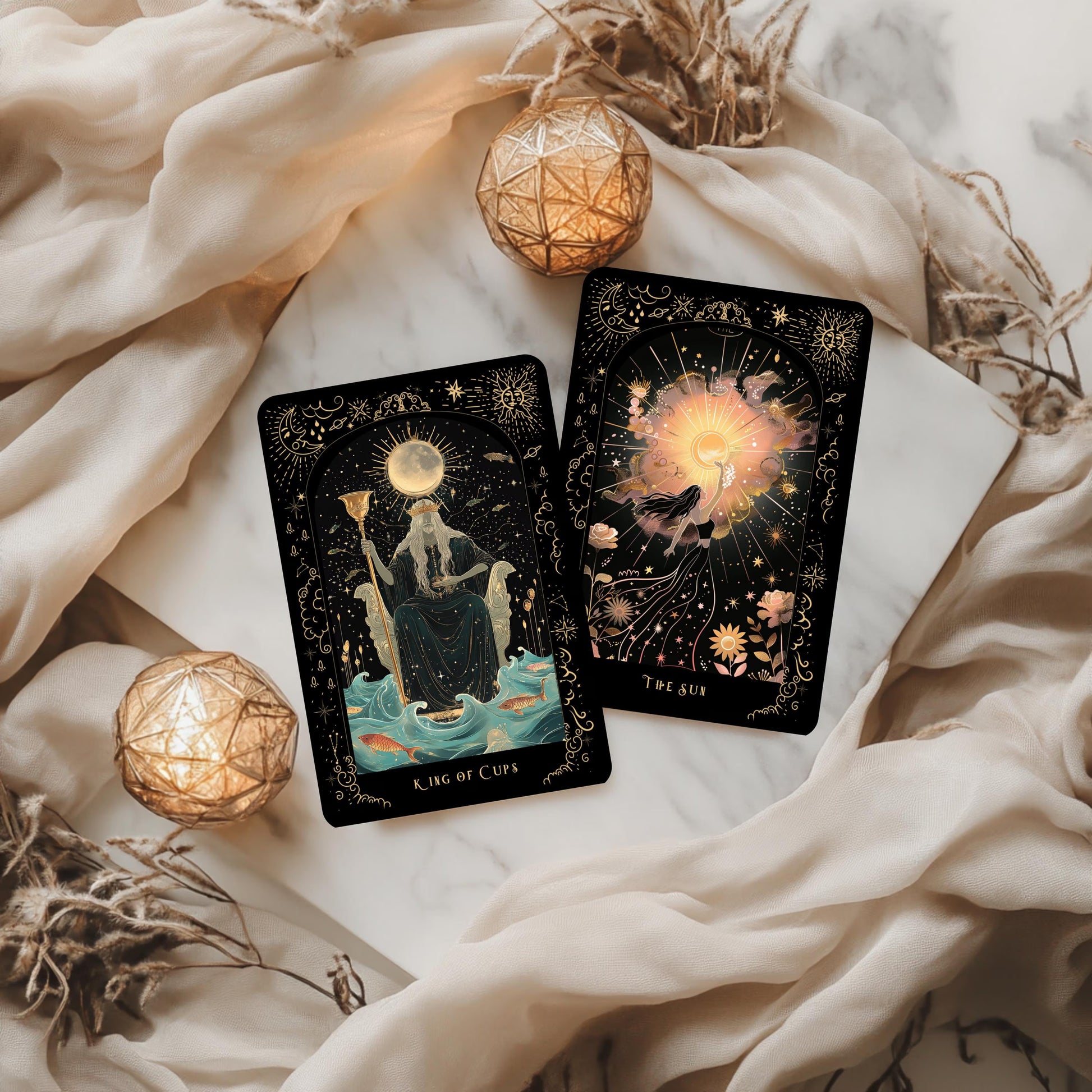 Every illustration begins with original concepts and custom prompts, then is hand-finished to refine shapes, balance light and color, add textures and ornamental details, adjust symbolism, and ensure consistency across the full deck. AI is used as a supportive tool—each final piece is curated and refined through an artist’s design process.